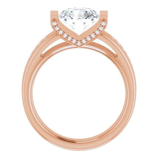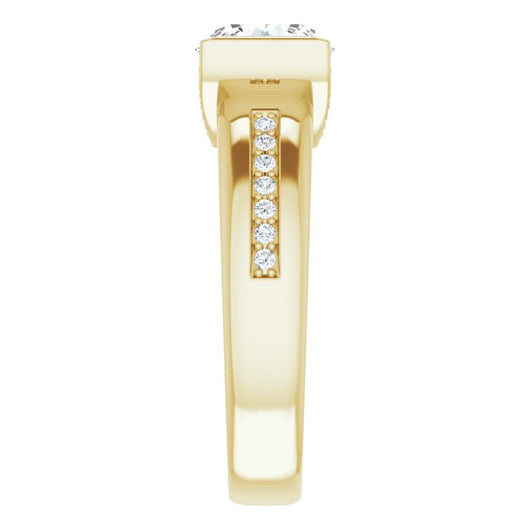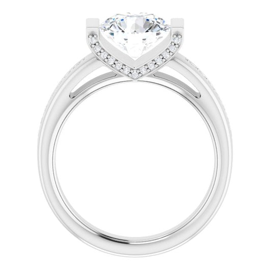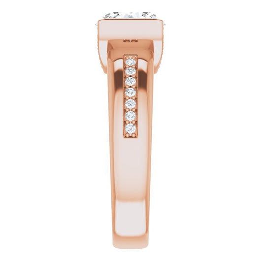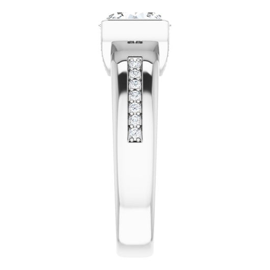 * Your ring’s total carat weight (TCW), band width, weight in grams, and/or number and size of accent, pavé, or halo stones will vary up or down depending on your choice of customizable center stone shape and size, precious metal type, and finger ring size via the drop-down options provided.