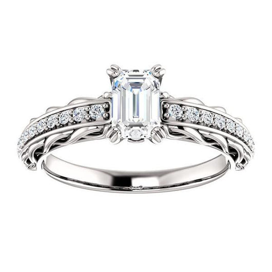 Cubic Zirconia Engagement Ring- The Melody (Customizable Emerald Cut Style with Lacy Filigree Metal Band Plus Pavé and Peekaboo Accents)