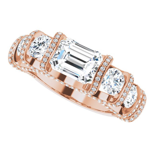 10K Rose Gold Customizable Bar-set Emerald/Radiant Cut 5-stone Design Plus Grandiose Pavé Accents