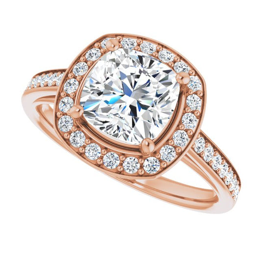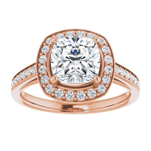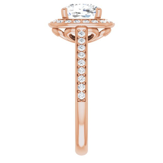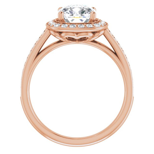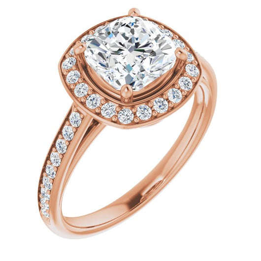 10K Rose Gold Customizable Cathedral-raised Cushion Cut Halo-and-Accented Band Design