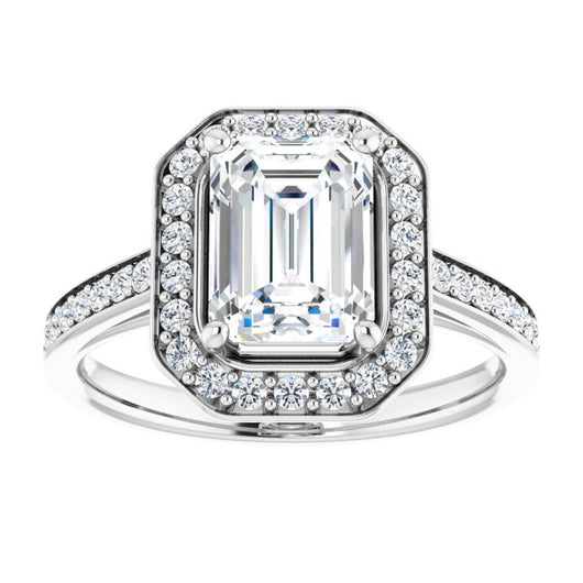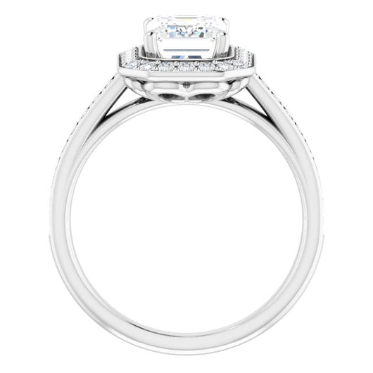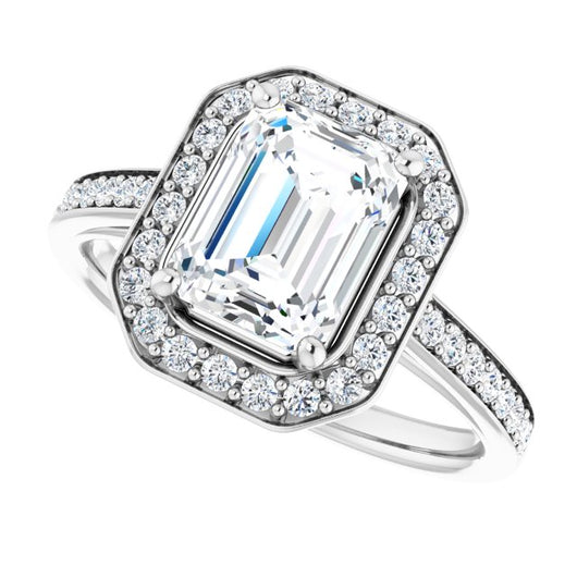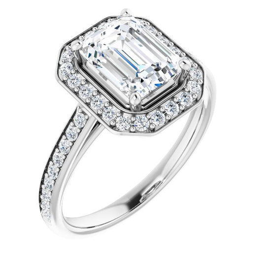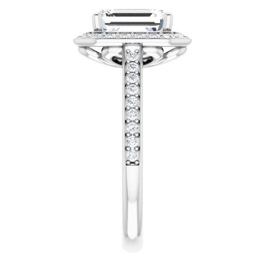 10K White Gold Customizable Cathedral-raised Emerald/Radiant Cut Halo-and-Accented Band Design