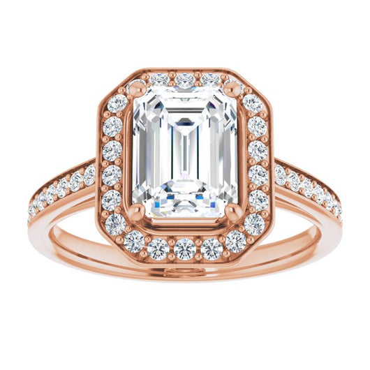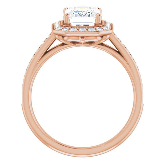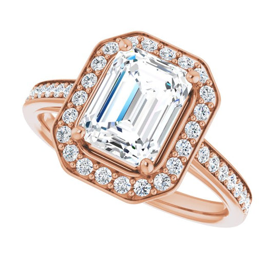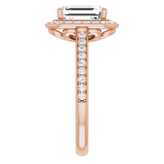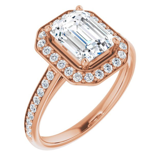 10K Rose Gold Customizable Cathedral-raised Emerald/Radiant Cut Halo-and-Accented Band Design