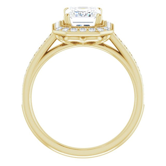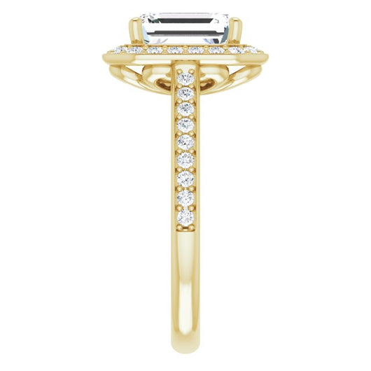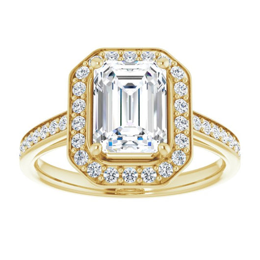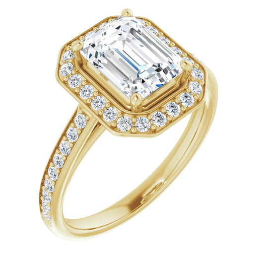 10K Yellow Gold Customizable Cathedral-raised Emerald/Radiant Cut Halo-and-Accented Band Design
