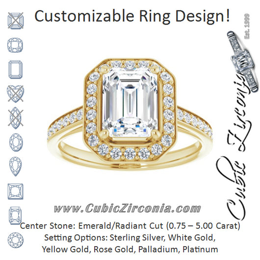Cubic Zirconia Engagement Ring- The Natascha Eva (Customizable Cathedral-raised Emerald Cut Halo-and-Accented Band Design)
