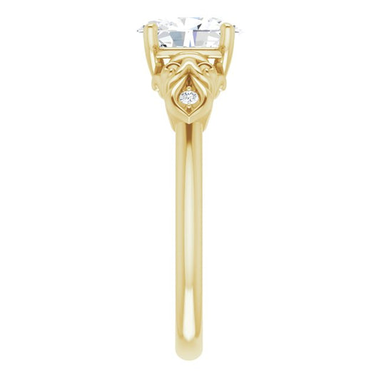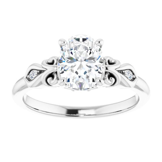 This is not a traditional three-stone ring per se since the two (2) side stones are so small (just 1.30 mm* round cuts) compared to the big center stone. Gorgeous filigree/carving creates an ultra-thin, 2.19 mm tapered to 2.03 mm* band reminiscent of summer foliage. The decorative-trellis and prong setting reveals the Oval cut center stone in all of its radiant glory. Whether smallest 0.50 carat, largest 5.00* carat, or a carat size in between, The Natsumi's center stone will stand in for a beautiful bloom you wish could last forever.
