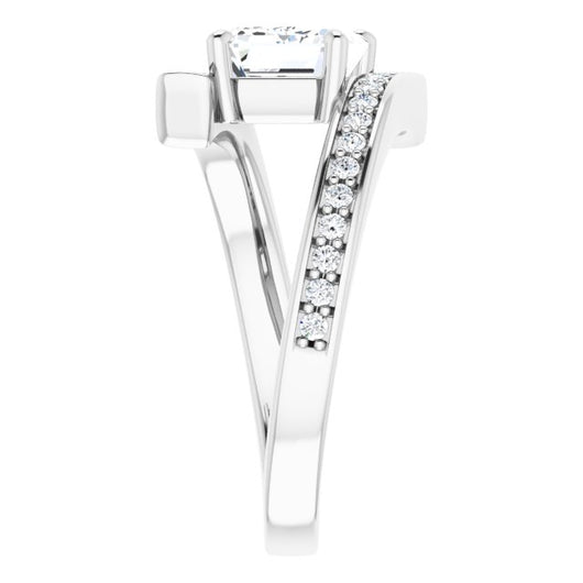 The Nayeli engagement ring comes standard with the symmetry she craves. This artisan bypass band is squared on each end, and precisely decorated with 28* pinpoint-set, round-cut cubic zirconia accent stones. The Radiant cut center stone is prong-set but you could almost call it a faux-bar-setting, because the center stone appears to sit magically between the two widely separated bypass band sections.