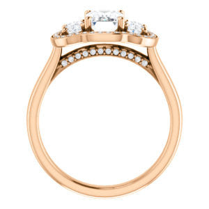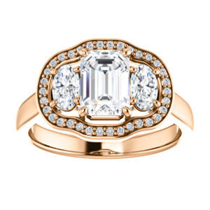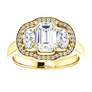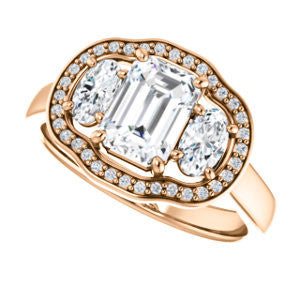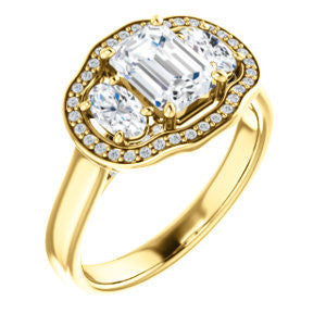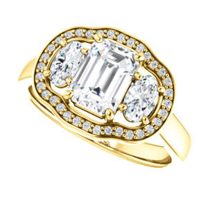 Cubic Zirconia Engagement Ring- The Nettie (Customizable Enhanced 3-stone Halo-Surrounded Design with Emerald Cut Center, Dual Oval Cut Accents, and Decorative Pavé-Accented Trellis)