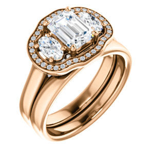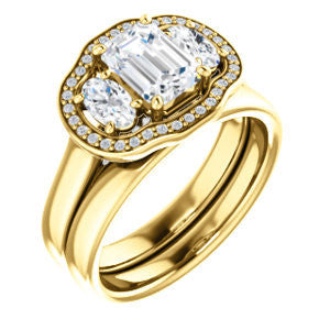Take this cathedral-raised Emerald Cut ring featuring two flanking 5.00x3.00 mm oval cut accent stones, for example. We call The Nettie an ‘enhanced three-stone design’ because the style starts with a 3-stone design and then we start making enhancements. Triple halo surrounding the three primary stones? Check. Stackable ring that will fit well not just with the matching band, but many other stackable bands as well? Check. Decorative pavé-accented trellis underneath the center setting to create a sweet three-sided view from any angle against the finger? Check. Excuse me, just talking about this has gotten me wanting to make a baby myself. You going to do your part, too? Get The Nettie engagement ring as a stand-alone or together with the matching anniversary band to complete the cubic zirconia bridal set!