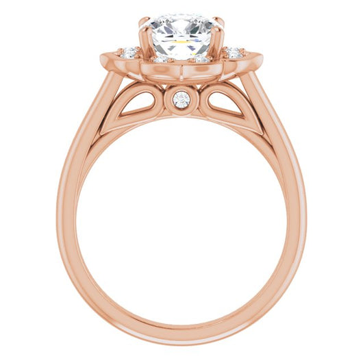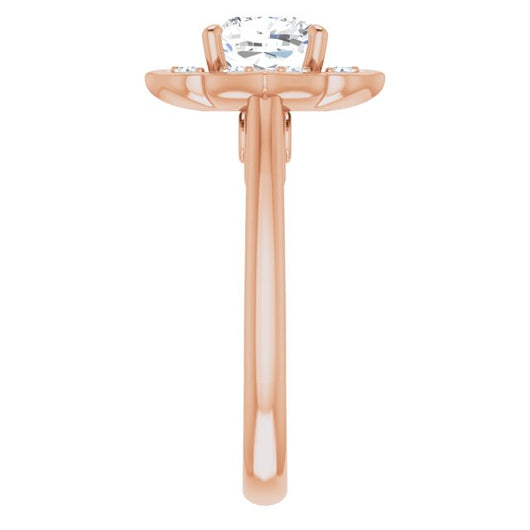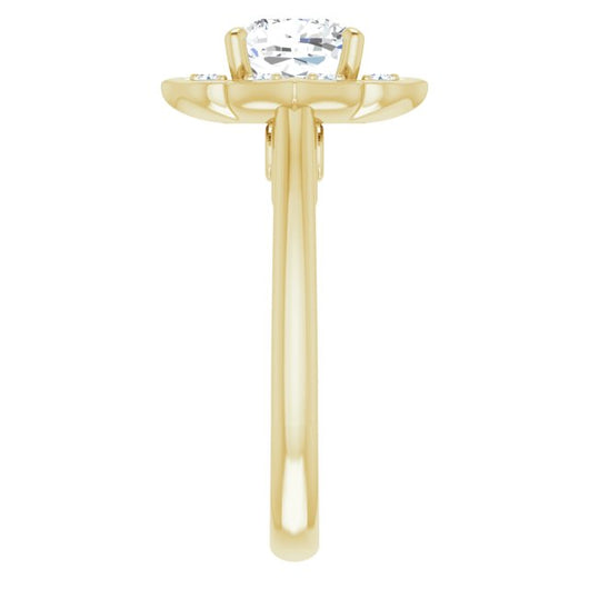 * Your ring’s total carat weight (TCW), band width, weight in grams, and/or number and size of accent, pavé, or halo stones will vary up or down depending on your choice of customizable center stone shape and size, precious metal type, and finger ring size via the drop-down options provided.