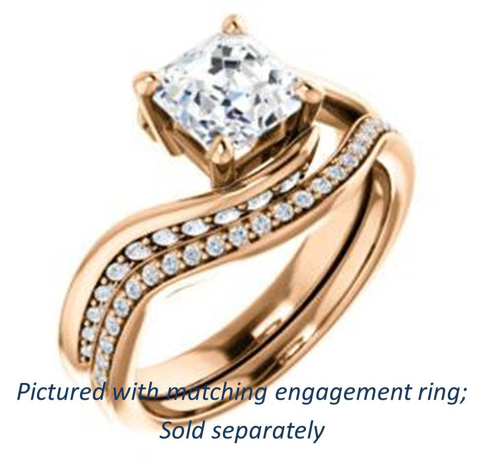 Striking in style and delicate in design, this precision-machined, prong-set Asscher Cut ring will be crafted in your choice of White, Rose or Yellow Gold, Palladium, .925 Sterling Silver or pure 950 Platinum. The artisan curved-contour, tapered-band design will highlight your choice of a 0.65, 1.00, 1.50, 2.50, 3.50 or 5.0 carat diamond-quality Asscher Cut CZ center stone. A hidden rarity in jewelry, the three-sided band style places twenty-two (22)* small round-cut pavé band accents directly into the side of the twisting bypass band. Get The Nicola engagement ring as a stand-alone or together with the matching anniversary band to complete the cubic zirconia bridal set!