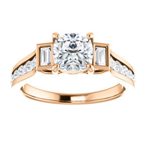 The Portia celebrates the duality of tradition meeting innovation. This 5A cubic zirconia engagement ring is an innovative piece of jewelry, yet 'safe' with time-tested features followed by a few final flourishes that resulted in this design qualifying for a new name. Take a traditional 3-stone design with Cushion Cut center stone and baguettes to either side, then add a dozen journey-style round-cut band accents. But don't make those round accents so small as to be considered pavé stones; instead, make them big enough in millimeter dimensions to really POP. While you're at it, bezel-set those flanking baguette accents (instead of the more traditional prong-setting style). Go for a cathedral setting, but do it with an extra flourish of decorative prongs.