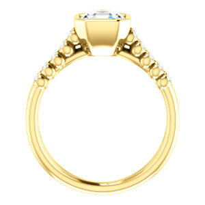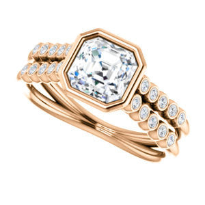 If this bezel-set Asscher cut engagement ring had a theme song it would be surf-crooner Jack Johnson's romantic acoustic guitar melody "Better Together". That’s because you get the best of both old world simplicity and trendy new world design. A sexy ring with an unashamedly wide body and split-banded tapering “legs for days”, The Rafaella is a ring that brings everything worn with it up a notch (or three). This bubble-beaded design comes manufactured in your choice of 12 precious metals with twenty (20) bezel-set, 1.30 mm* round-cut side band accents marching on both sides of a two-part band. The band descends sharply on either side from the high center setting, an increasingly popular design element known as “cathedral-style”.