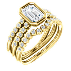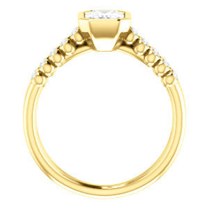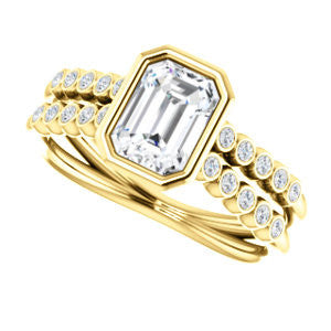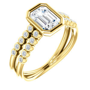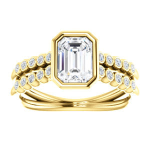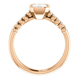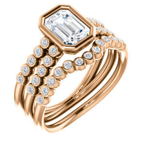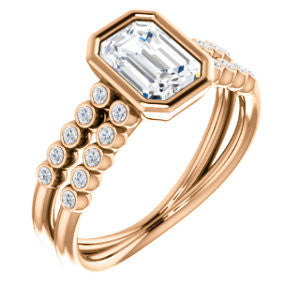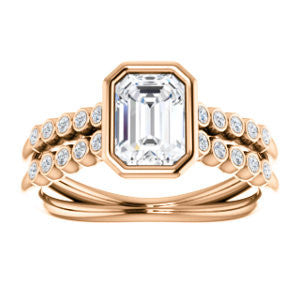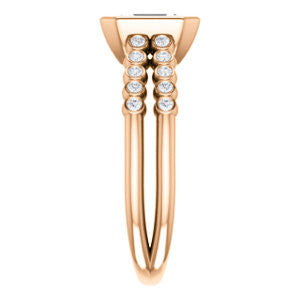 If this bezel-set Radiant cut engagement ring had a theme song it would be surf-crooner Jack Johnson's romantic acoustic guitar melody "Better Together". That’s because you get the best of both old world simplicity and trendy new world design. A sexy ring with an unashamedly wide body and split-banded tapering “legs for days”, The Rafaella is a ring that brings everything worn with it up a notch (or three). This bubble-beaded design comes manufactured in your choice of 12 precious metals with twenty (20) bezel-set, 1.30 mm* round-cut side band accents marching on both sides of a two-part band. The band descends sharply on either side from the high center setting, an increasingly popular design element known as “cathedral-style”.