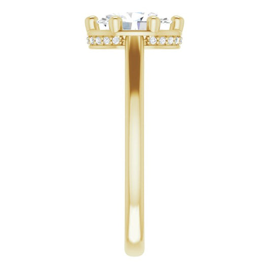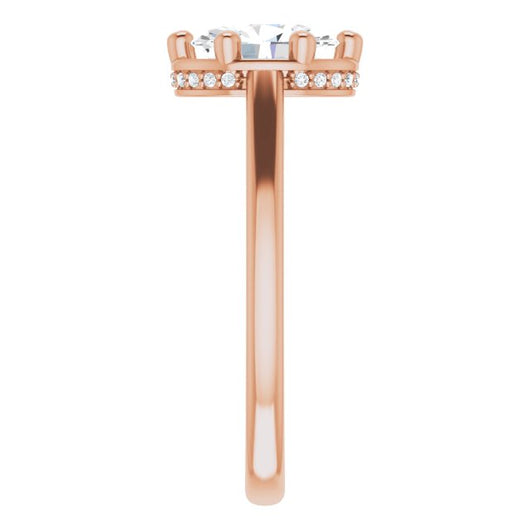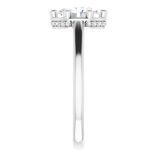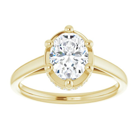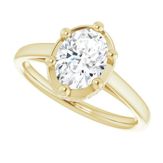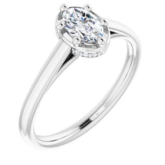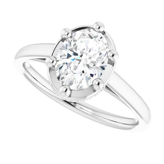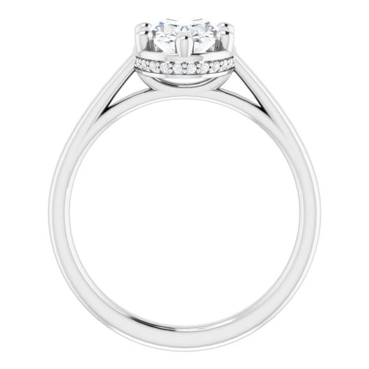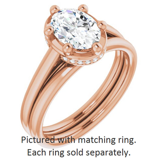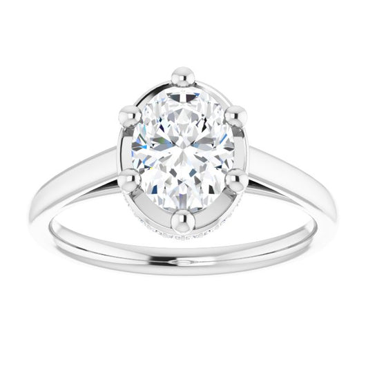We're talking about an undercover loving "under-halo" of 20* round-cut, shared-prong accents. These sometimes-naughty, sometimes-nice and always hidden accent stones run in a circle above the raised cathedral setting and below the 5A diamond-quality Oval cut center stone in the carat size of your choice. Sexting with my future husband? Yes, please. Just keep it private, honey: the world is full of snoops.