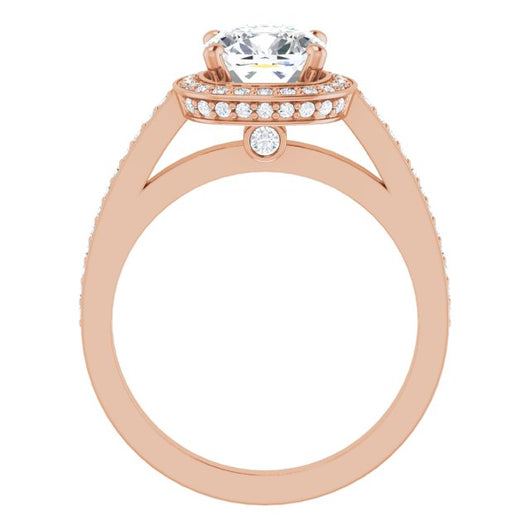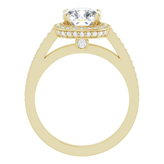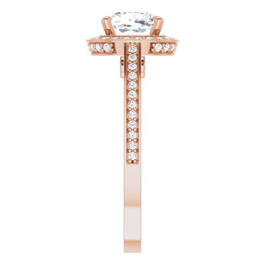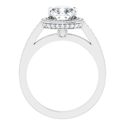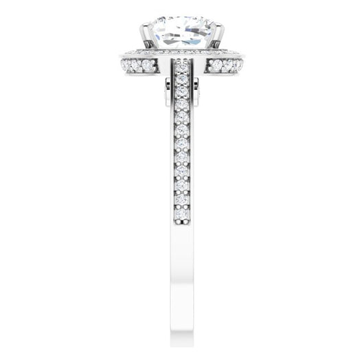 * Your ring’s total carat weight (TCW), band width, weight in grams, and/or number and size of accent, shared prong, or halo stones will vary up or down depending on your choice of customizable center stone shape and size, precious metal type, and finger ring size via the drop-down options provided.