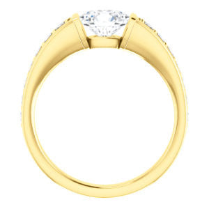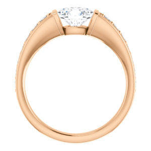 There's a beautiful oversized-stone, channel-inlaid pavé band on this baby. When that baby gets cranked up, it's like a full troop of musicians that suddenly decided to pull the old "play-n-stay" at your once-quiet house. This ring is LOUD, especially in the upper echelons of carat sized center stone choices (from 0.50 to 4.0 carats). You won't find many engagement ring bands as wide as Rosemary She's a hefty baby. And we mean that in totally the most flattering way. With so much blingin' metal weight, this is one of our most expensive engagement rings for sure**! The size of the side CZ gemstones in this hand-crafted special design are one of the ring's most popular features, but we really can't put our finger on why. It's a genuine mystery to us. I mean, we sell rings with more side stones, bigger side stones, and much more complex designs...so why the fascination with Rosemary's baby?