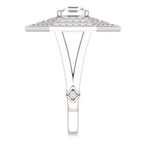 Extra special for your extra special, The Roza is an exquisite ring design far from the garden variety style most women feel comfortable wearing. Her style starts as a robust wide tapered-band ring with round-cut “knuckle accents”— that you can see from the side view pictures— four-fifths of the way down the precious metal split-band design. Then we set your choice of a 0.65 to 5.00 carat Asscher Cut center stone in secure prongs high above the band in a trendy cathedral setting. If Asscher Cut isn’t for you/her, click the “customize” link provided to see/buy this ring design set with any of seven (7) total center stone shapes available.