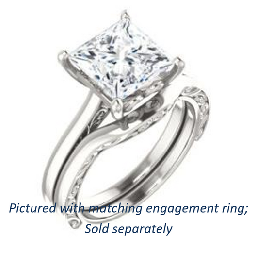 Yet this is a ring that imbues a sense of leisurely panache that translates into class in any language. The Salome engagement ring is surely simple, but her small touches create an exotic flair impossible to ignore. Raised cathedral-prong setting. Thin profile with tapered band with organic curvature. Plus patterned filigree inlaid in a three-sided style. Close your eyes and become a sexy, French character right out of a romance novel wearing The Salome’s classic look crafted in your choice of precious metals. Choose 2.50 to 2.50 carats for the Princess Cut center stone. We won’t tell a soul your life isn’t as exciting as your ring makes it look. Get The Salome engagement ring as a stand-alone or together with the matching anniversary band to complete the cubic zirconia bridal set!