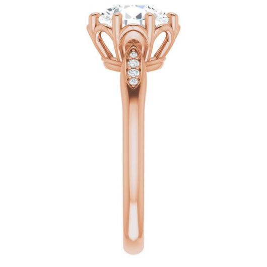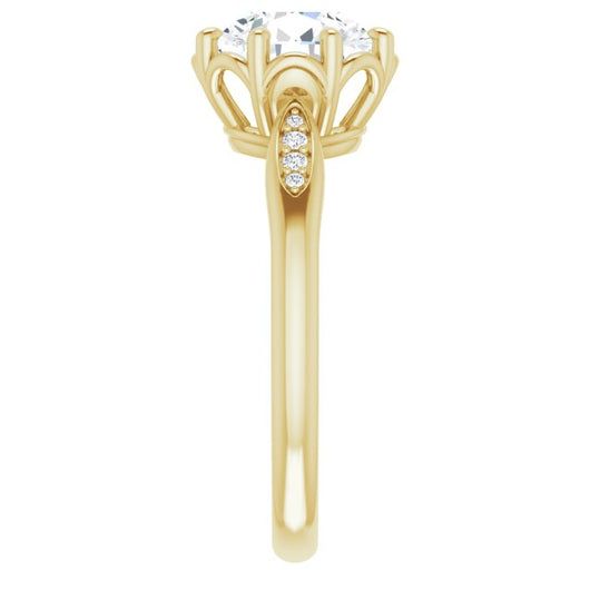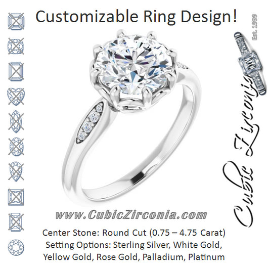 * Your ring’s total carat weight (TCW), band width, weight in grams, and/or number and size of accent, pavé, or halo stones will vary up or down depending on your choice of customizable center stone shape and size, precious metal type, and finger ring size via the drop-down options provided.