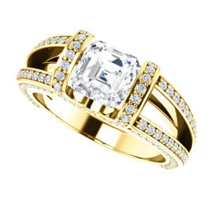 Frankly, dear, you may not give a damn what people think. And if that’s the case, you’ll be attracted to jewelry that portrays how very aloof you are from the fray. Featuring a stunning split-band ring shank inlaid with brilliant pavé-style small CZ stones cascading down from an Asscher Cut cubic zirconia center stone setting in any of your choice of sizes from 0.65 to 1.50 carats, this customizable prong-accented bar-basket engagement ring has enough flair for any two fashionistas. And what about that high-set, quasi-imperious, cathedral-center setting with its multitude of prong accents going up and down and around in horseshoe-like swoops? It’s not just playing "hard-to-get" when most men simply can’t measure up.