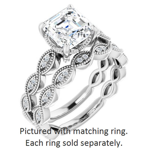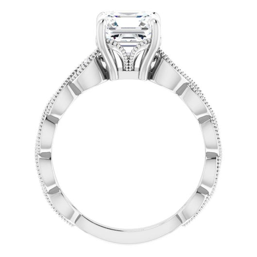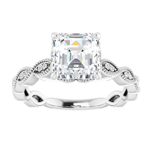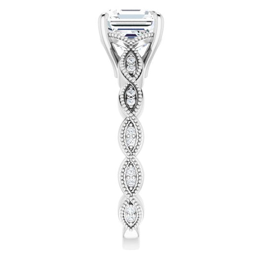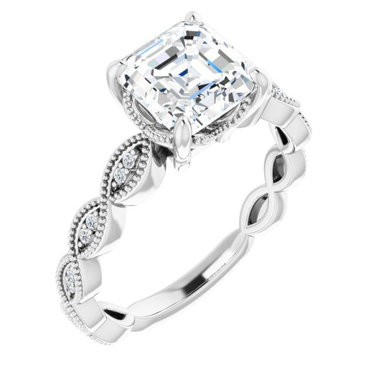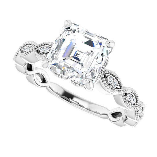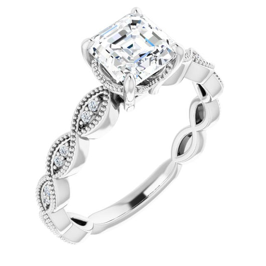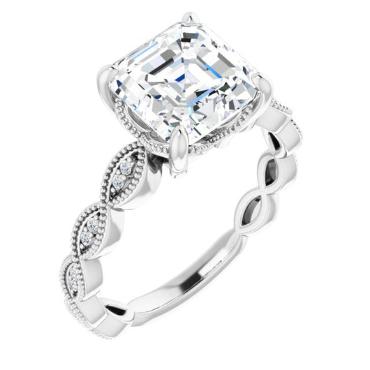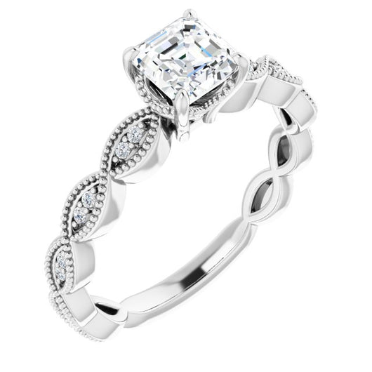 10K White Gold Customizable Asscher Cut Artisan Design with Scalloped, Round-Accented Band and Milgrain Detail