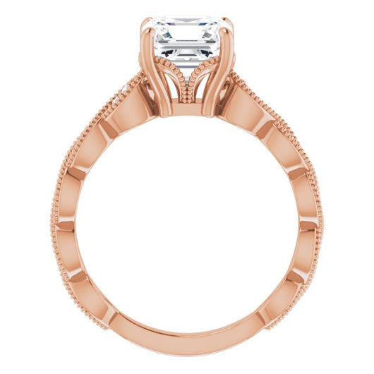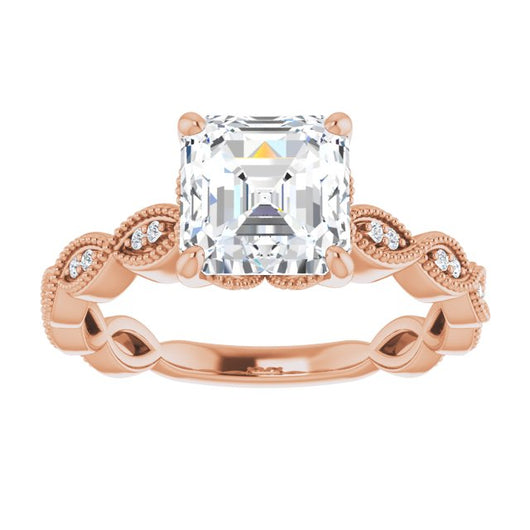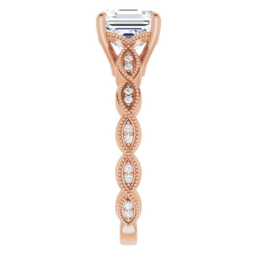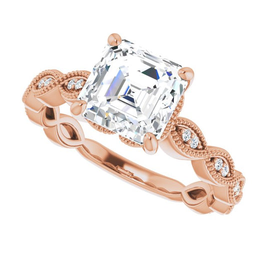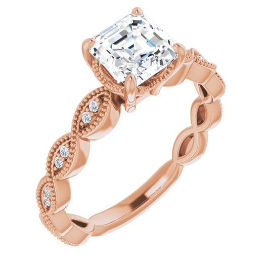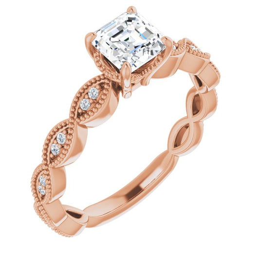 10K Rose Gold Customizable Asscher Cut Artisan Design with Scalloped, Round-Accented Band and Milgrain Detail