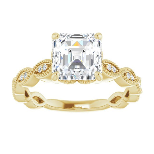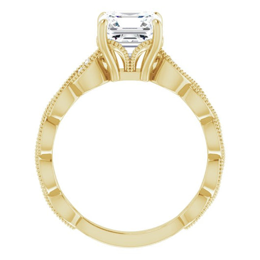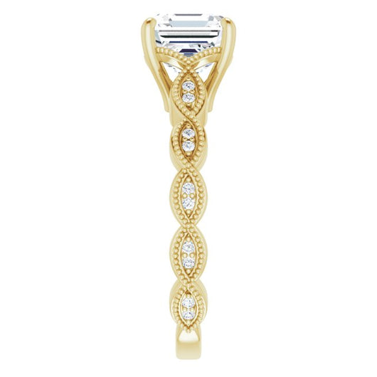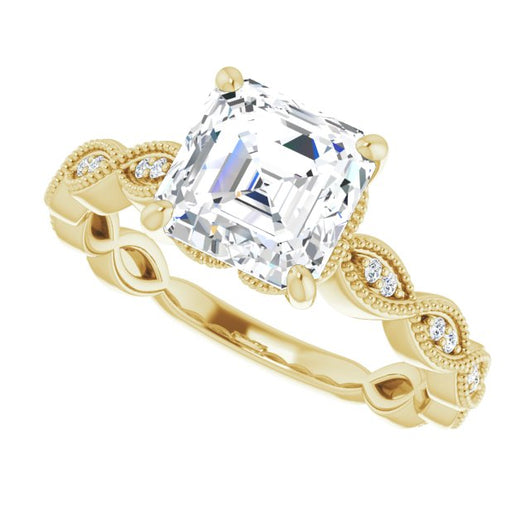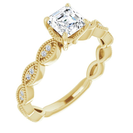 10K Yellow Gold Customizable Asscher Cut Artisan Design with Scalloped, Round-Accented Band and Milgrain Detail