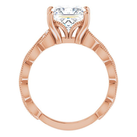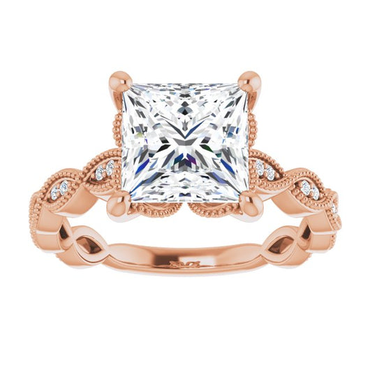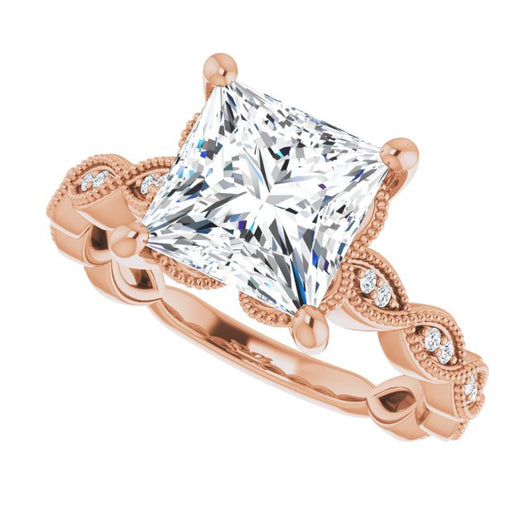 10K Rose Gold Customizable Princess/Square Cut Artisan Design with Scalloped, Round-Accented Band and Milgrain Detail