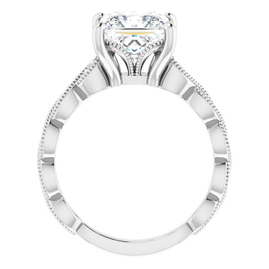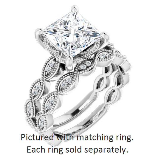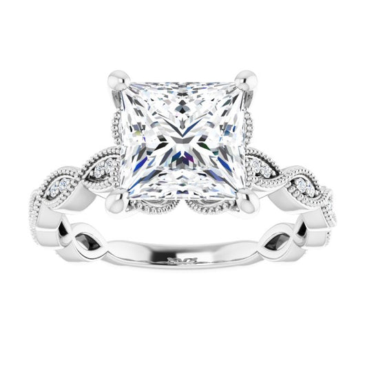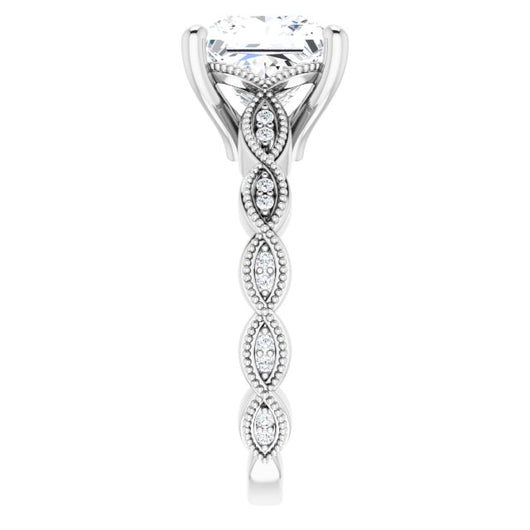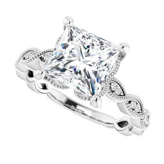 10K White Gold Customizable Princess/Square Cut Artisan Design with Scalloped, Round-Accented Band and Milgrain Detail