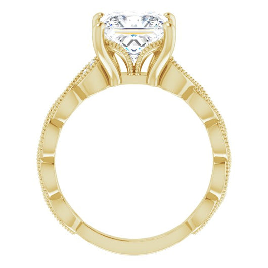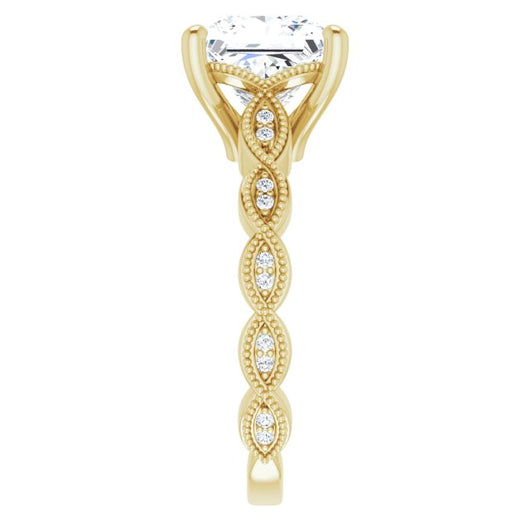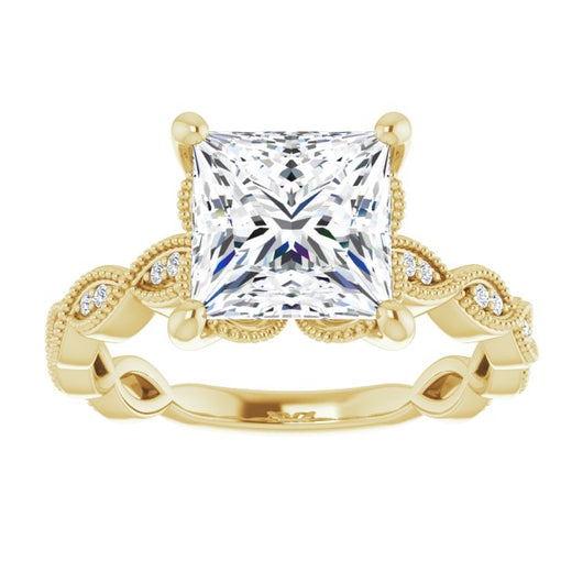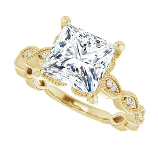 10K Yellow Gold Customizable Princess/Square Cut Artisan Design with Scalloped, Round-Accented Band and Milgrain Detail