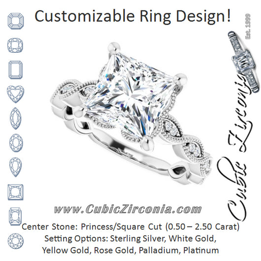 Cubic Zirconia Engagement Ring- The Shanice (Customizable Princess/Square Cut Artisan Design with Scalloped, Round-Accented Band and Milgrain Detail)