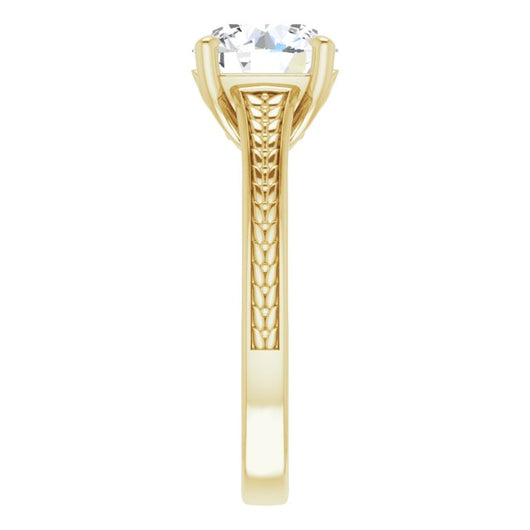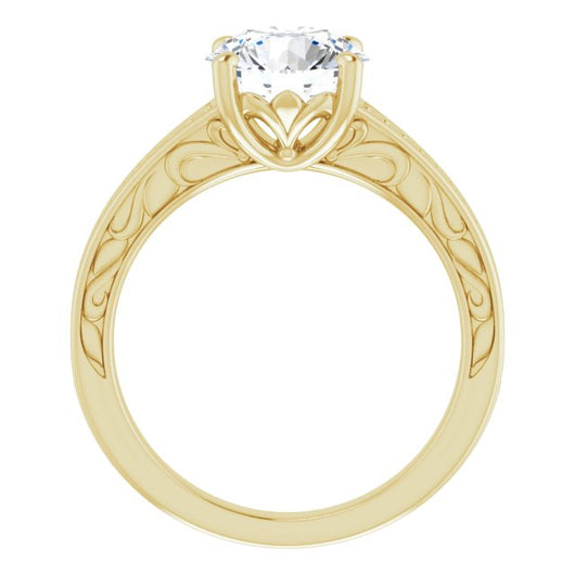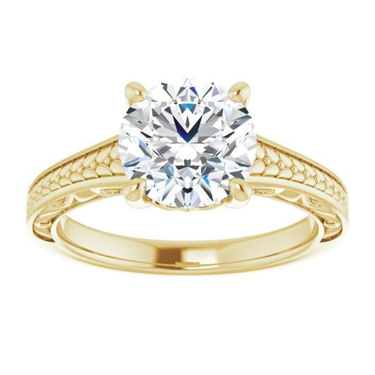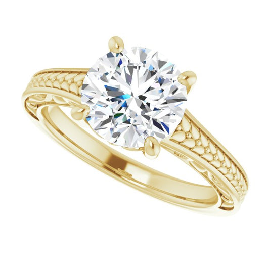 14K Yellow Gold Customizable Round Cut Solitaire with Organic Textured Band and Decorative Prong Basket