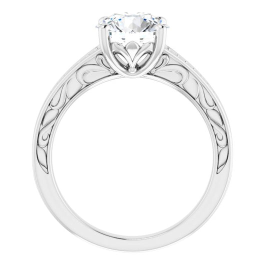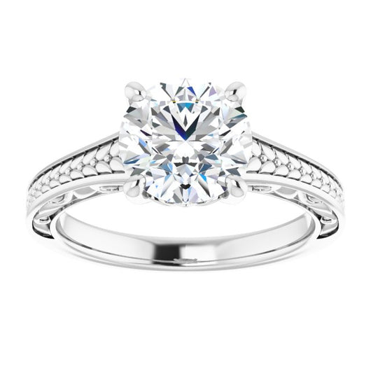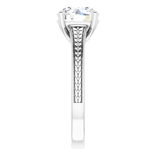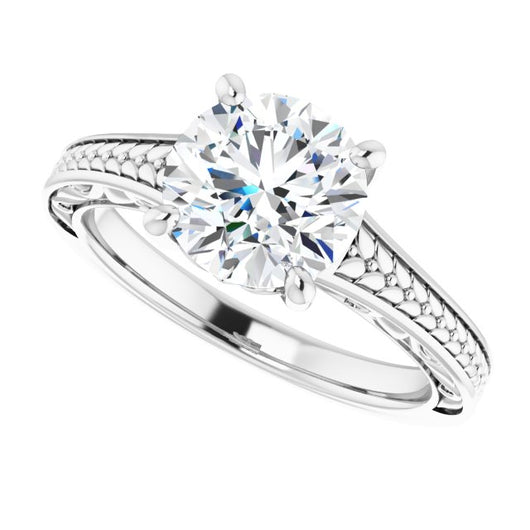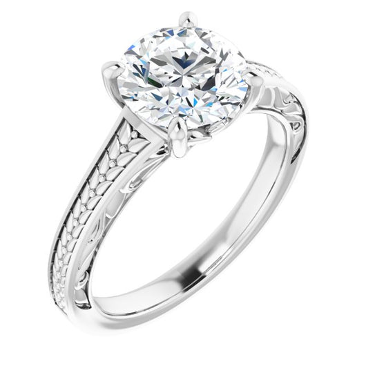 14K White Gold Customizable Round Cut Solitaire with Organic Textured Band and Decorative Prong Basket
