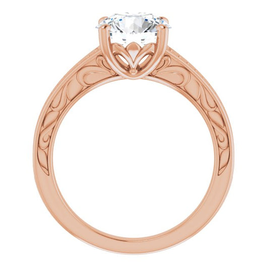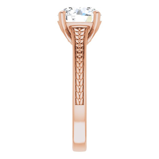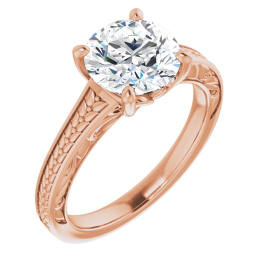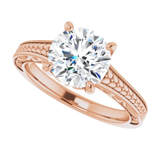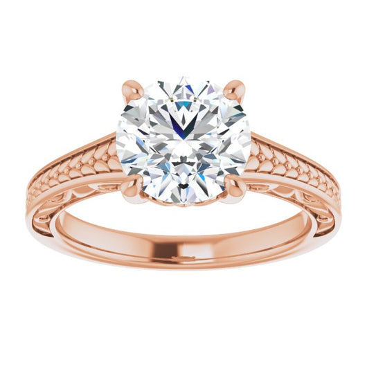 14K Rose Gold Customizable Round Cut Solitaire with Organic Textured Band and Decorative Prong Basket