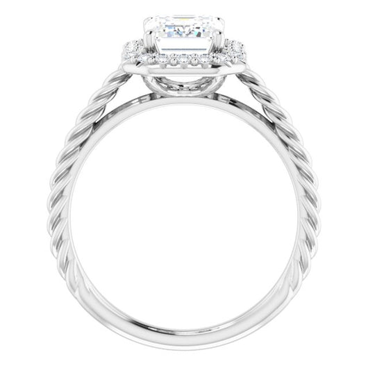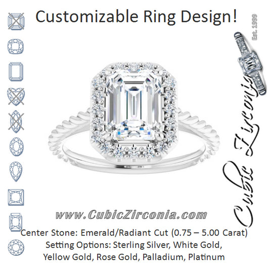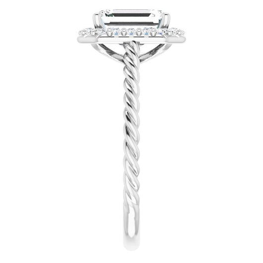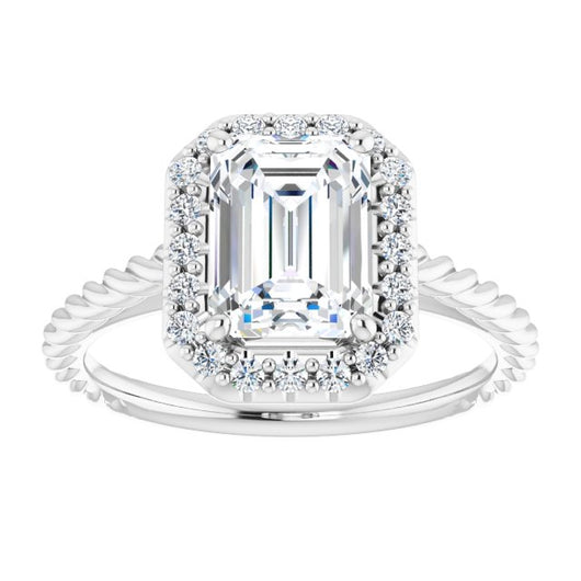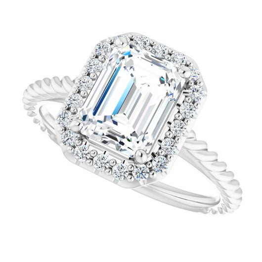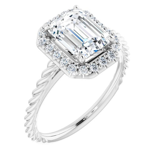 10K White Gold Customizable Cathedral-set Emerald/Radiant Cut Design with Halo and Twisty Rope Band