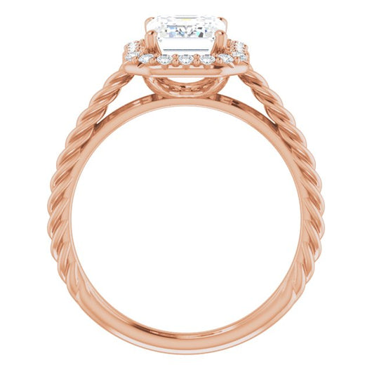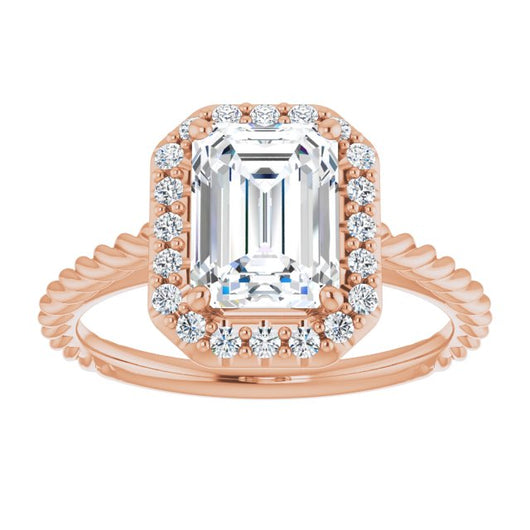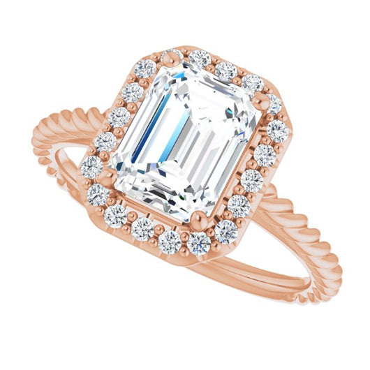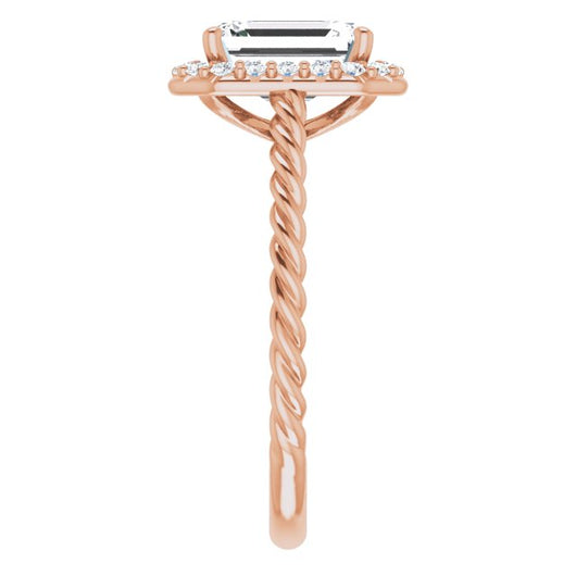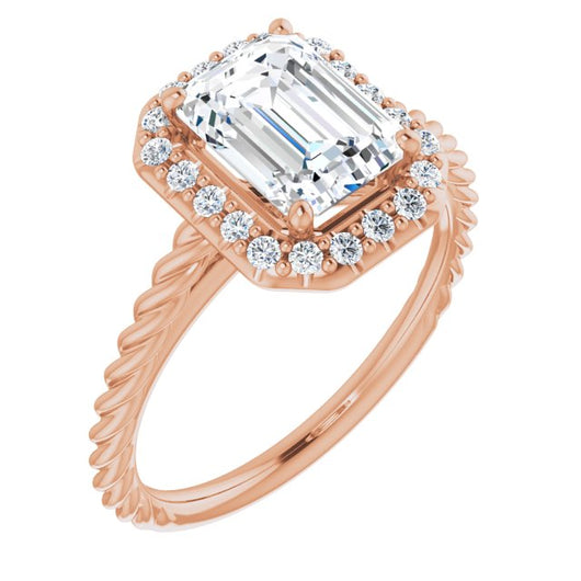 10K Rose Gold Customizable Cathedral-set Emerald/Radiant Cut Design with Halo and Twisty Rope Band
