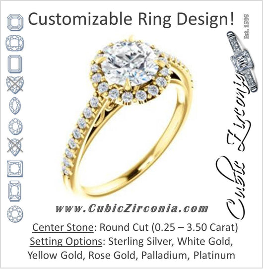 Cubic Zirconia Engagement Ring- The Sunshine (Customizable Round Cut Halo Design with Vintage Cathedral Trellis and Thin Pavé Band)