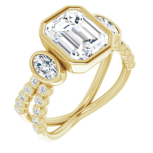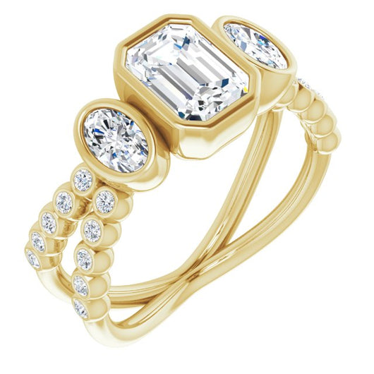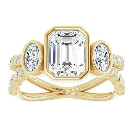 10K Yellow Gold Customizable Bezel-set Emerald/Radiant Cut Design with Dual Bezel-Oval Accents and Round-Bezel Accented Split Band