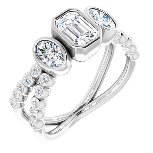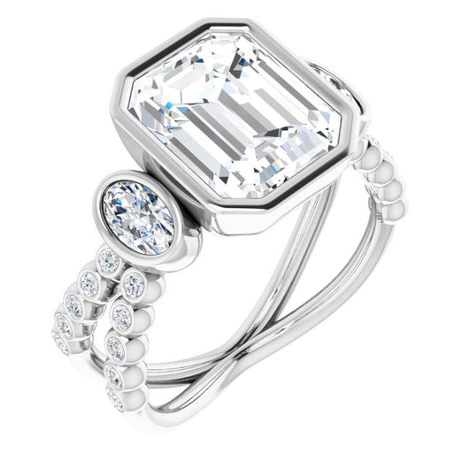 10K White Gold Customizable Bezel-set Emerald/Radiant Cut Design with Dual Bezel-Oval Accents and Round-Bezel Accented Split Band
