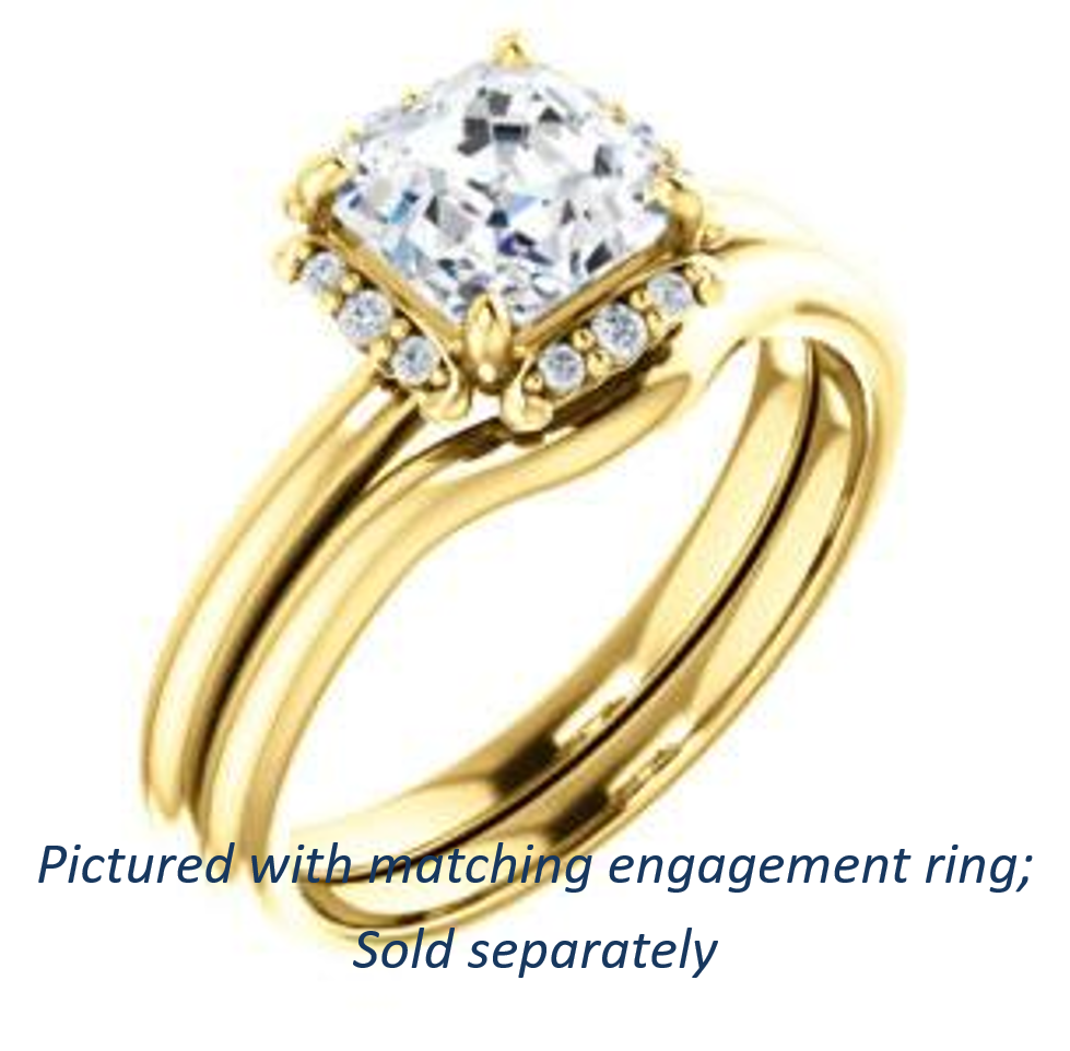 Do you know what it’s like to grab all the attention, effortlessly attracting a coterie of devoted followers who hang off your every word like co-stars to your leading lady? This might be your big chance. Shine on, star! A fun and quirky thin-banded design, featuring twelve (12)* round-cut halo accent stones surrounding the center Asscher Cut setting, The Tiara Rose's design features combine to create one illustrious look designed to pluck passersby right off the street and deposit them right in your belt pouch. I can see Queen B wearing this ring style...can’t you? Or is it time for a new Queen to be chosen? Now you’re going to be famous, too, at least in your own social circle. Get The Tiara Rose engagement ring as a stand-alone or together with the matching anniversary band to complete the cubic zirconia bridal set!