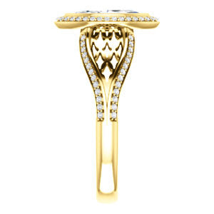 The Timothea is a cathedral-set, halo-style artisan engagement ring with wide engraved band. The alluring three-sided style features exotic round-cut pavé band accents placed in such a way as to caress the finger (privately), revealing it's rare third side only to those Her Grace allows to get close to your person. The Timothea's center stone shape is customizable, so she will never look the same way twice as each purchaser can choose not only Marquise Cut (as pictured and priced on this webpage, from 0.25 to 2.0 carats in size), but also six other center stone options. This is a look that turns heads, with a wide max width of 5.04* mm and a tall height of 26.73 mm that naturally stands out in any crowd. With this ring, we thee offer a taste of life as someone wedded into old-world European royalty. We just can't prove it. Get The Timothea engagement ring as a stand-alone or together with the matching anniversary band to complete the cubic zirconia bridal set!