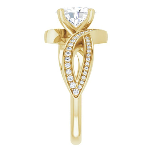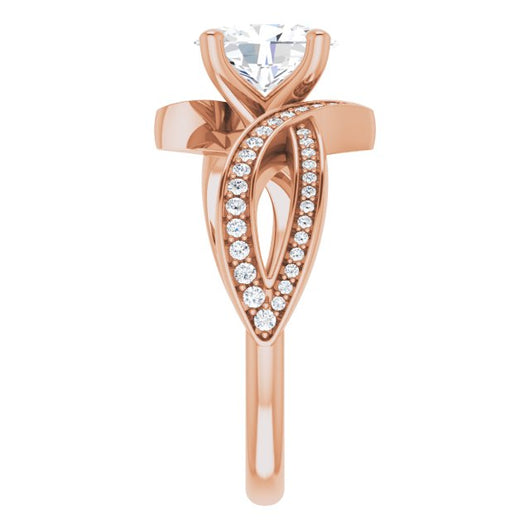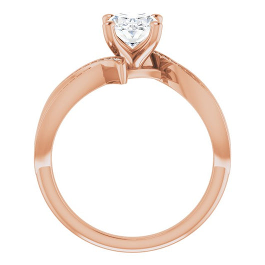 * Your ring’s total carat weight (TCW), band width, weight in grams, and/or number and size of accent, shared prong, or halo stones will vary up or down depending on your choice of customizable center stone shape and size, precious metal type, and finger ring size via the drop-down options provided.
