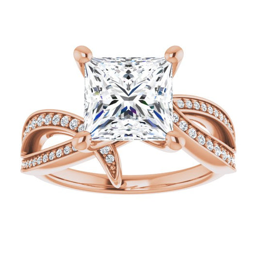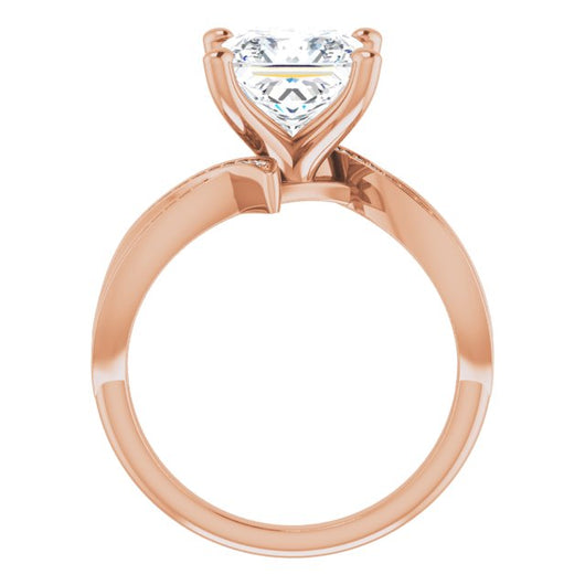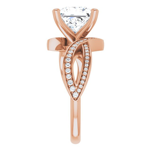 * Your ring’s total carat weight (TCW), band width, weight in grams, and/or number and size of accent, shared prong, or halo stones will vary up or down depending on your choice of customizable center stone shape and size, precious metal type, and finger ring size via the drop-down options provided.