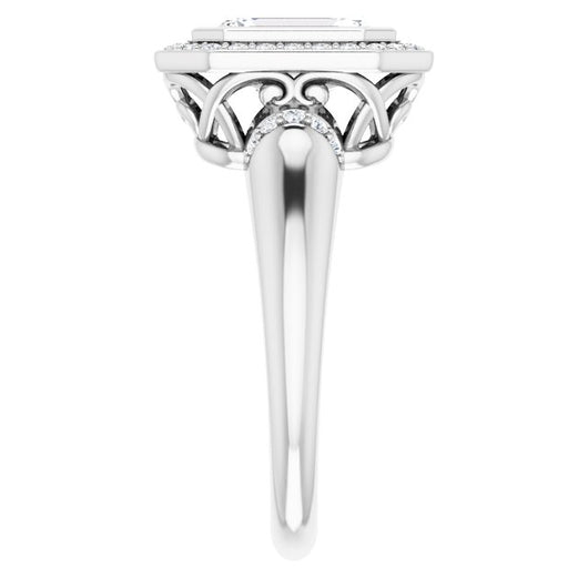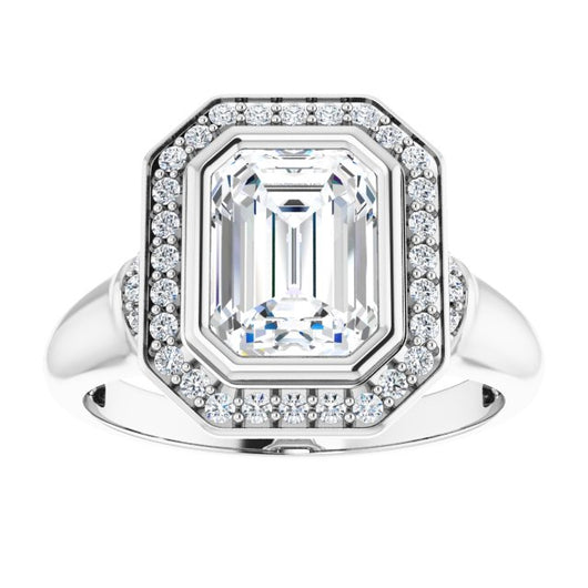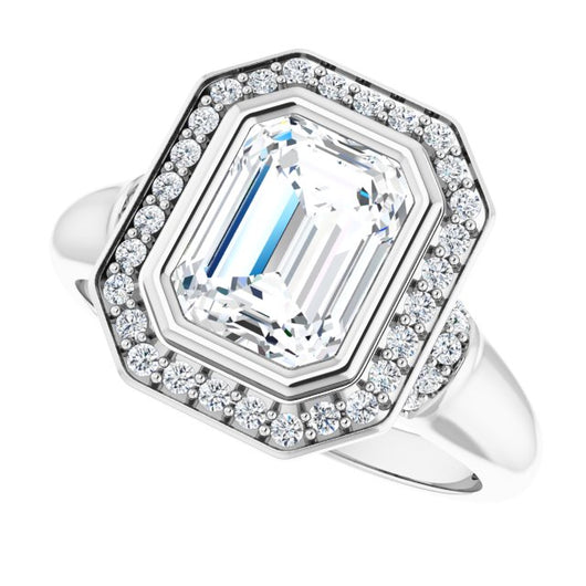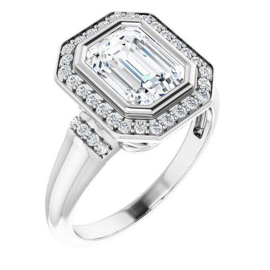 10K White Gold Customizable Bezel-set Emerald/Radiant Cut Design with Halo and Vertical Round Channel Accents