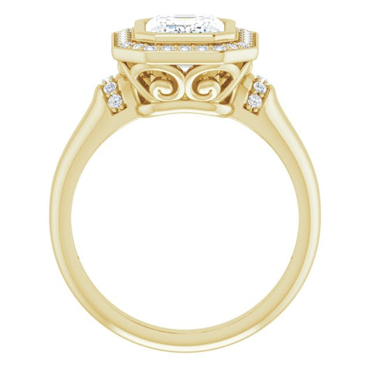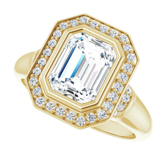 10K Yellow Gold Customizable Bezel-set Emerald/Radiant Cut Design with Halo and Vertical Round Channel Accents