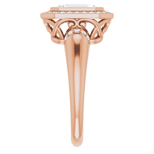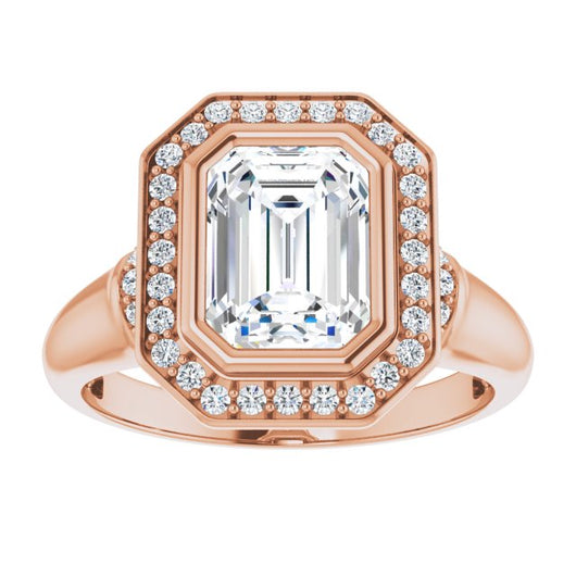 10K Rose Gold Customizable Bezel-set Emerald/Radiant Cut Design with Halo and Vertical Round Channel Accents