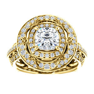 Cubic Zirconia Engagement Ring- The Violet (Customizable Cushion Cut 2x Halo Blossom Setting with Intricate Triple-Row Pavé Split Band)