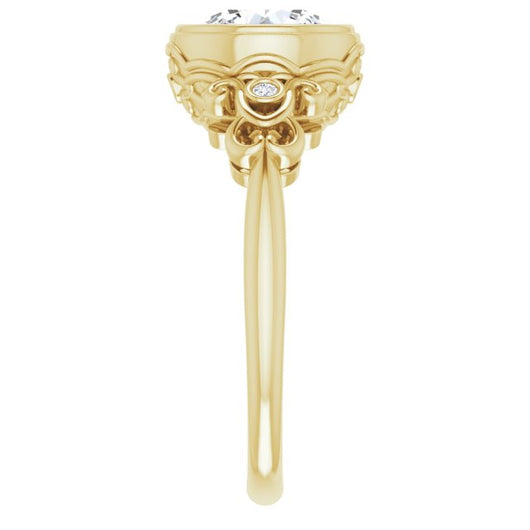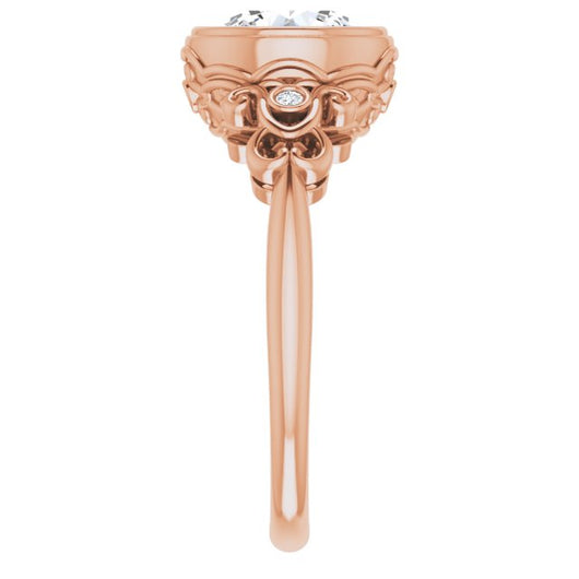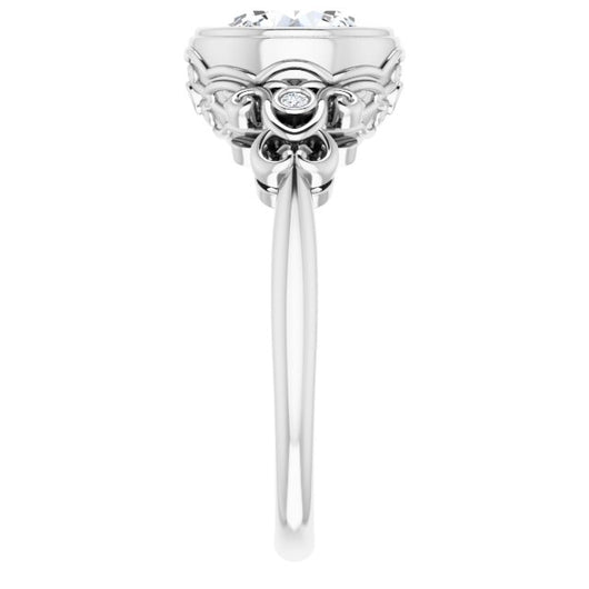 * Your ring’s total carat weight (TCW), band width, weight in grams, and/or number and size of accent, pavé, or halo stones will vary up or down depending on your choice of customizable center stone shape and size, precious metal type, and finger ring size via the drop-down options provided.
