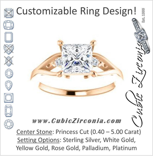 Cubic Zirconia Engagement Ring- The Willie Jo (Customizable 3-stone Princess Cut Design with Small Round Cut Accents and Decorative Cathedral Trellis)