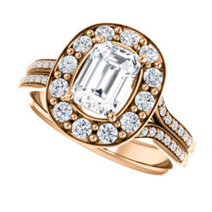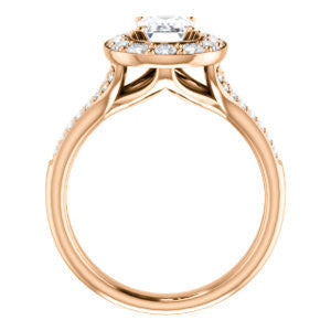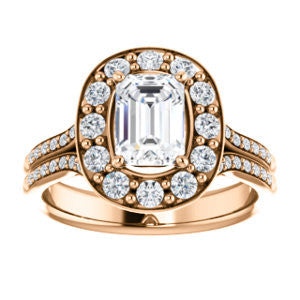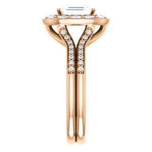 This ultra-wide, split-band engagement ring band tells a powerful story. It’s a story of one man and one woman who come together to bond their lives in marriage, even as both sections of The Yasmine’s pavé-accented band come back together underneath the 5A Radiant Cut Cubic Zirconia center stone to raise the trellis-decorated setting high in the cathedral style. We invite you to inhale deeply of the bouquet of a better life suggested by the flower-inspired halo of twelve (12)* 2.00 mm larger accent stones that surround the Radiant Cut center stone of 0.33 to 5.0 carats.